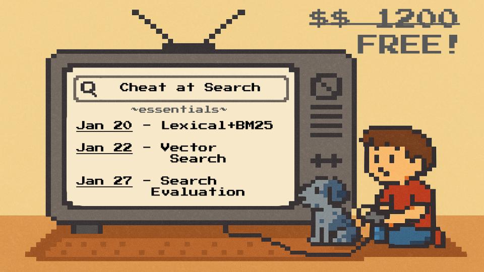 Cheating at Search is a lifestyle. I teach Cheating at Search with Agents. But the ‘Cheat at Search lifestyle’ goes beyond just LLMs. So in this free series of talks you’ll learn how to improve search with the essential concepts and techniques. Hence my free “Cheat at Search: Essentials” course.
